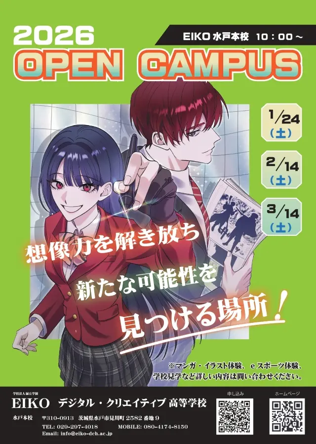 ■開催時間 10:00~12:00(受付9:30~) 学校説明・施設案内の他、マンガ・イラスト体験、eスポーツ体験、個別相談を開催しますので、お気軽にご参加ください。中学2年生、転入学・編入学をお考えの皆様も大歓迎! ■お申し込みは、チラシのQRコード、ホームページまたは電話にてご予約をお願いいたします。